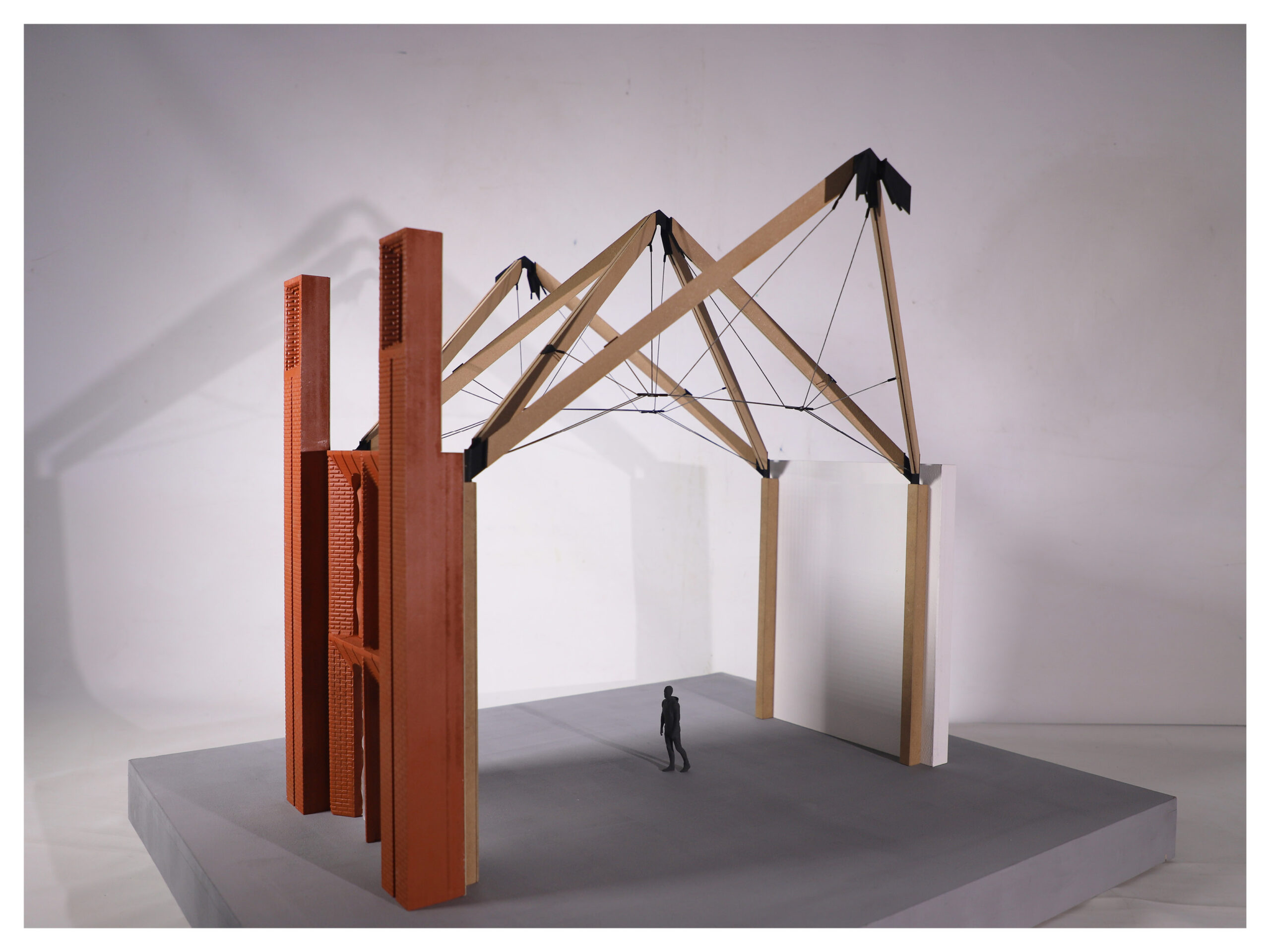 This commitment to innovation is further demonstrated through extensive and experimental physical modeling. A multi-scalar approach (1:50, 1:20, and 1:2) was employed to test every aspect of the design. The 1:2 birdhouse prototype was uniquely crafted by casting Jesmonite in a clay mould, which was then treated with a weak acid wash to create a realistic terracotta texture. For the highly complex structural nodes, an advanced SAF powder 3D printer was utilized. This rigorous process involved constant problem-solving, from designing custom supports for 3D printed parts to using piano strings for the tension system when standard wires failed.