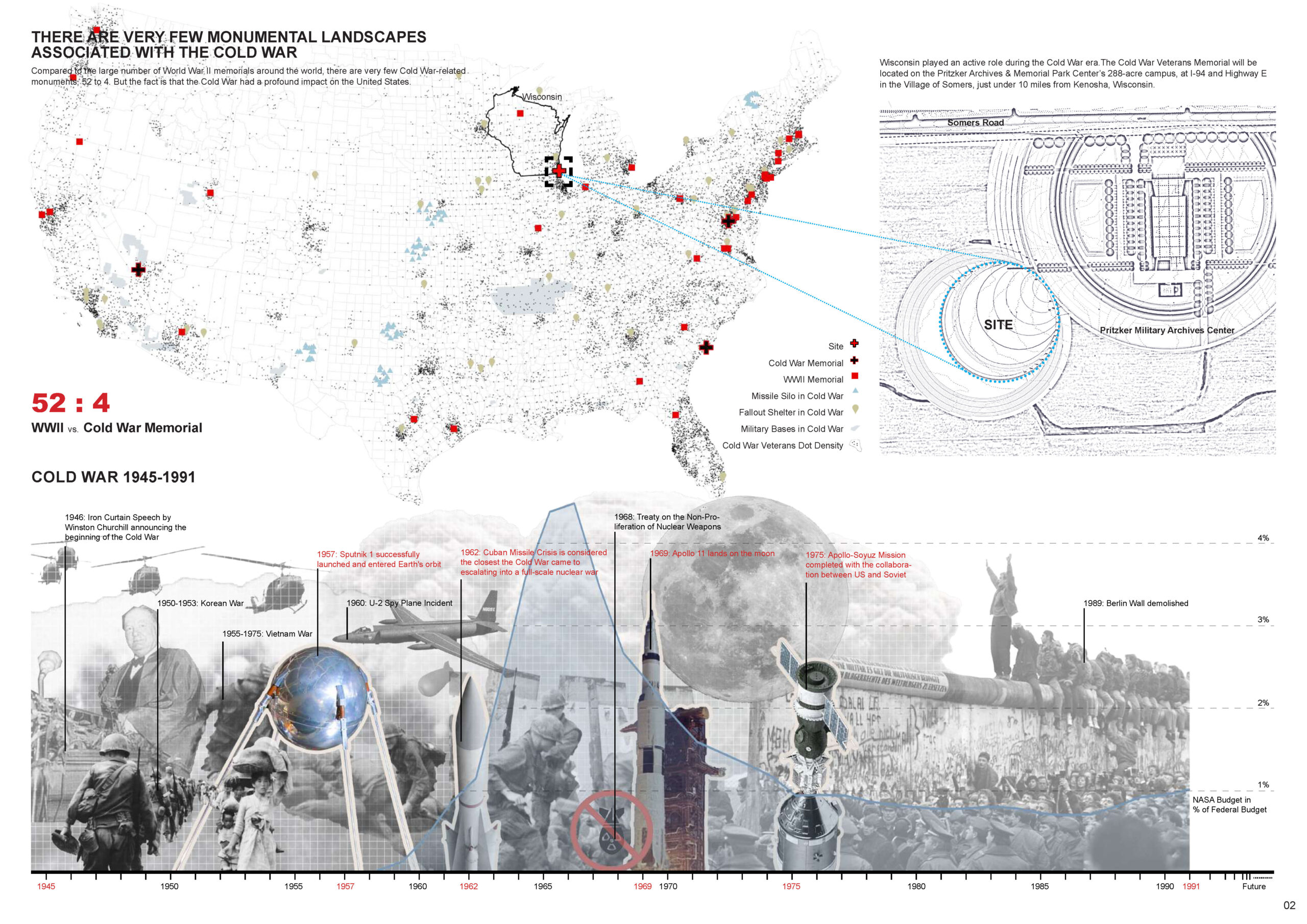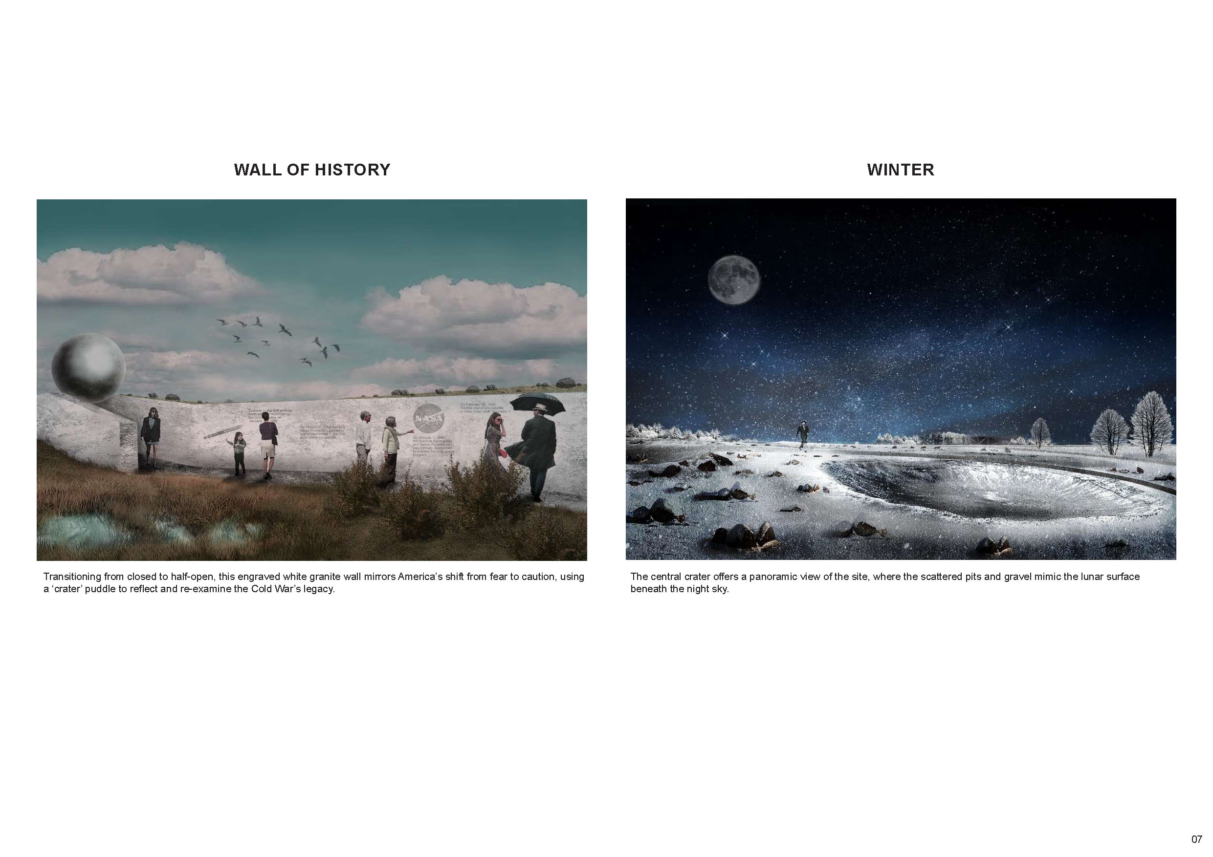 The design also responds to the climate of Wisconsin, intentionally embracing seasonal transformation. In winter, snow-covered landforms and sparse vegetation create a quiet, desolate atmosphere that reflects the tension and isolation associated with the Cold War era.