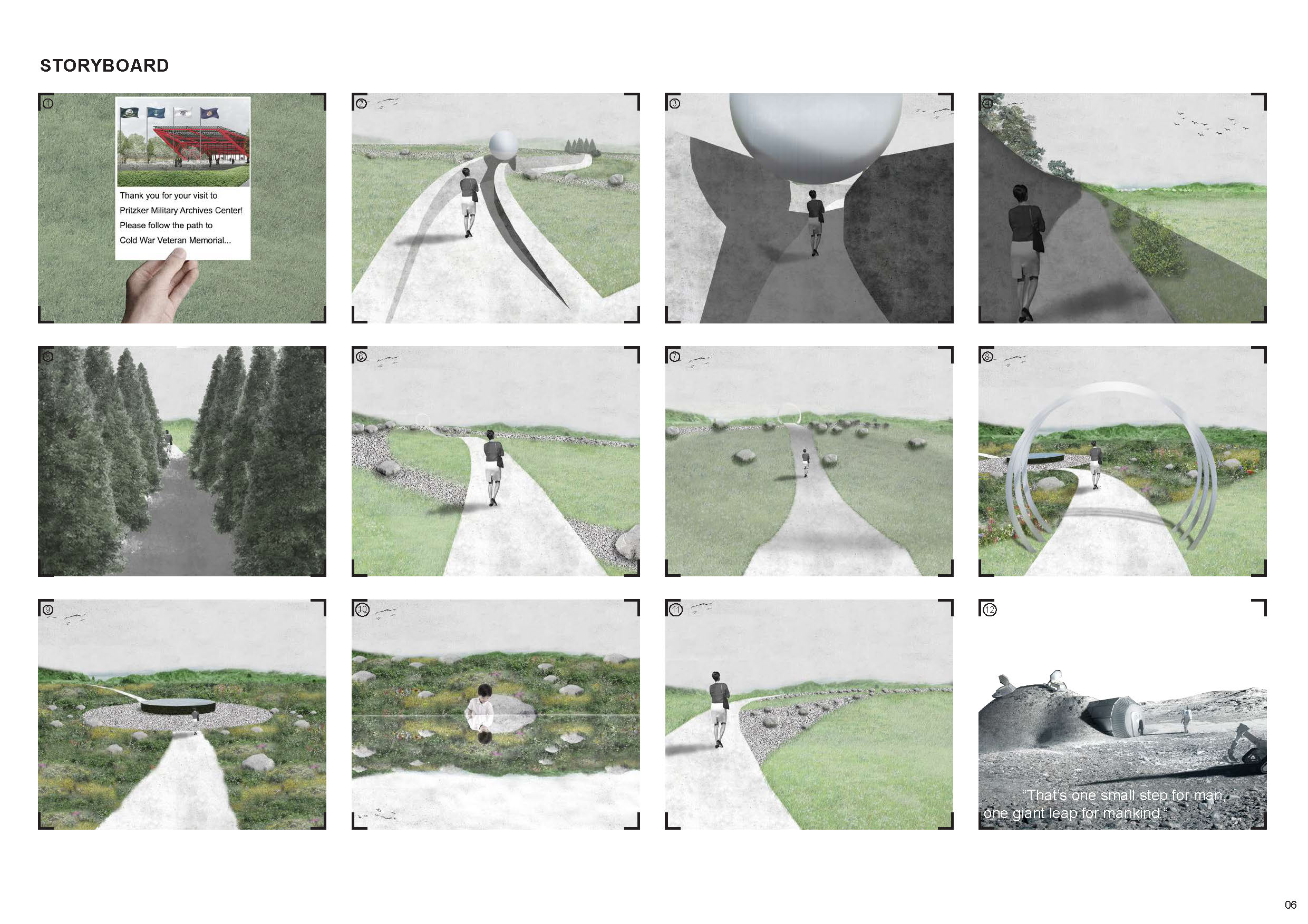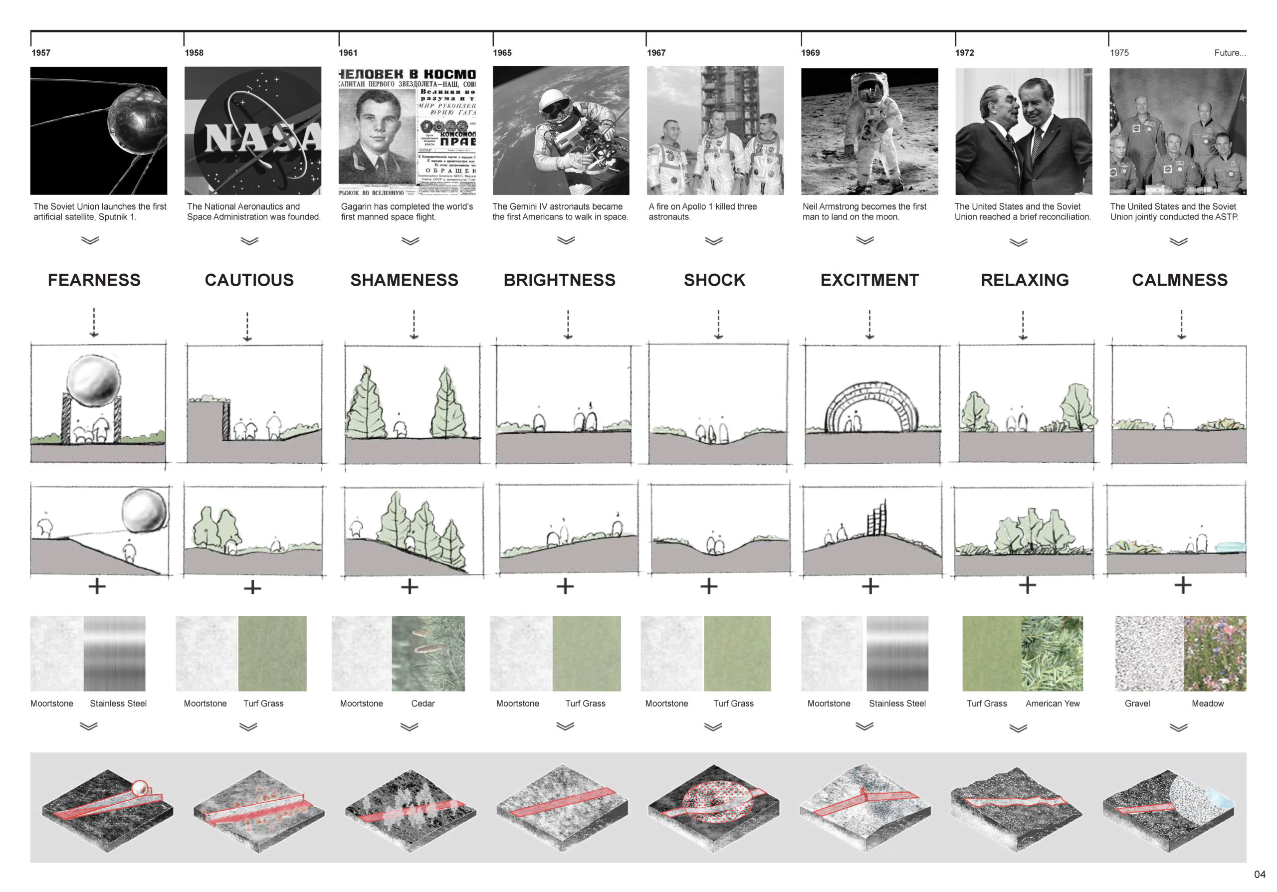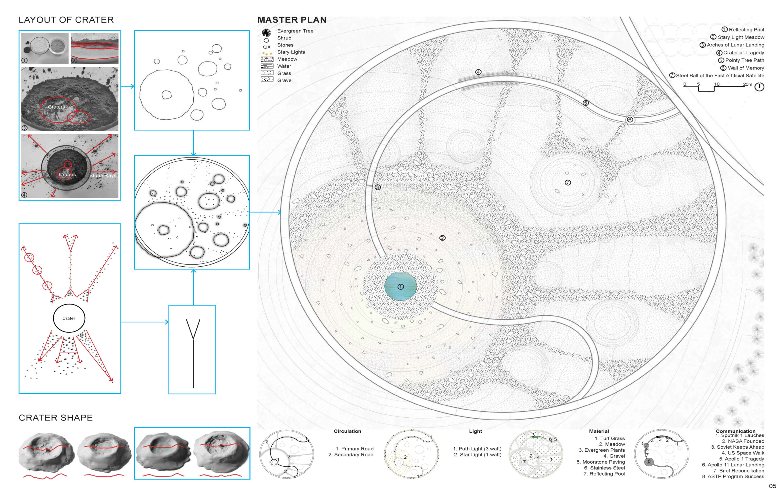 We interpret the Space Race through eight emotional experiences, forming a narrative that traces how the United States ultimately surpassed the Soviet Union in space exploration. Each stage is expressed through distinct spatial language and materiality. The pivotal milestone of the Space Race—the Apollo lunar landing—serves as the primary inspiration for the design. Landforms and stone arrangements are shaped to evoke lunar craters, while the experiential path moves across and cuts into the terrain, guiding visitors through the emotional sequence.