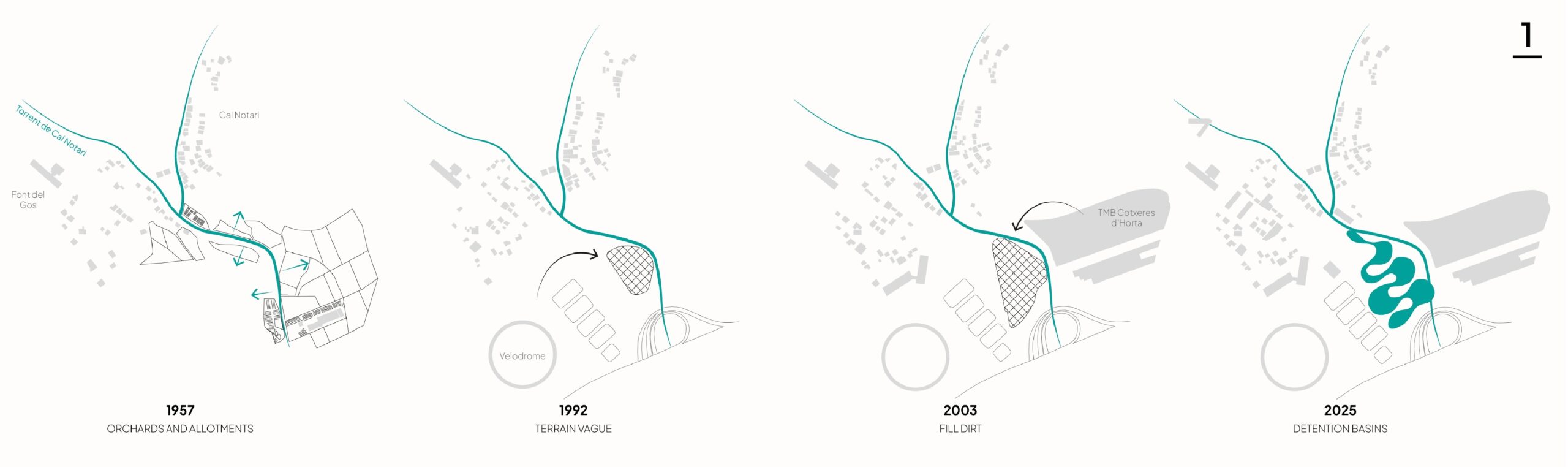 La Font del Gos is a marginalised fragment of Barcelona, suspended between the natural vitality of the Collserola mountains and the dense urban fabric of the city. Historically shaped by orchards and irrigation channels tied to the Riera d’Horta stream, the site once embodied a balance between cultivation, water, and community. This balance was lost in the late 20th century with the construction of major infrastructure — the Ronda de Dalt and the Velodrom d’Horta. The 1992 Olympic Games, though transformative for much of Barcelona, further marginalised this zone, converting it into terrain vague. Later, the excavation for Les Cotxeres d’Horta deposited layers of fill dirt over the valley, disfiguring the landscape and erasing its ecological memory.
