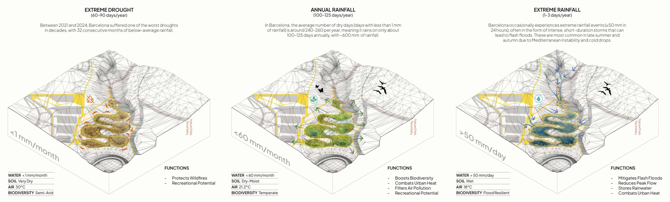 Rather than expanding outward, this proposal demonstrates a model of repair. La Font del Gos is no longer the city’s forgotten edge. It becomes a prototype for how land, water, and people can co-produce a regenerative, resilient, and socially just urban future.