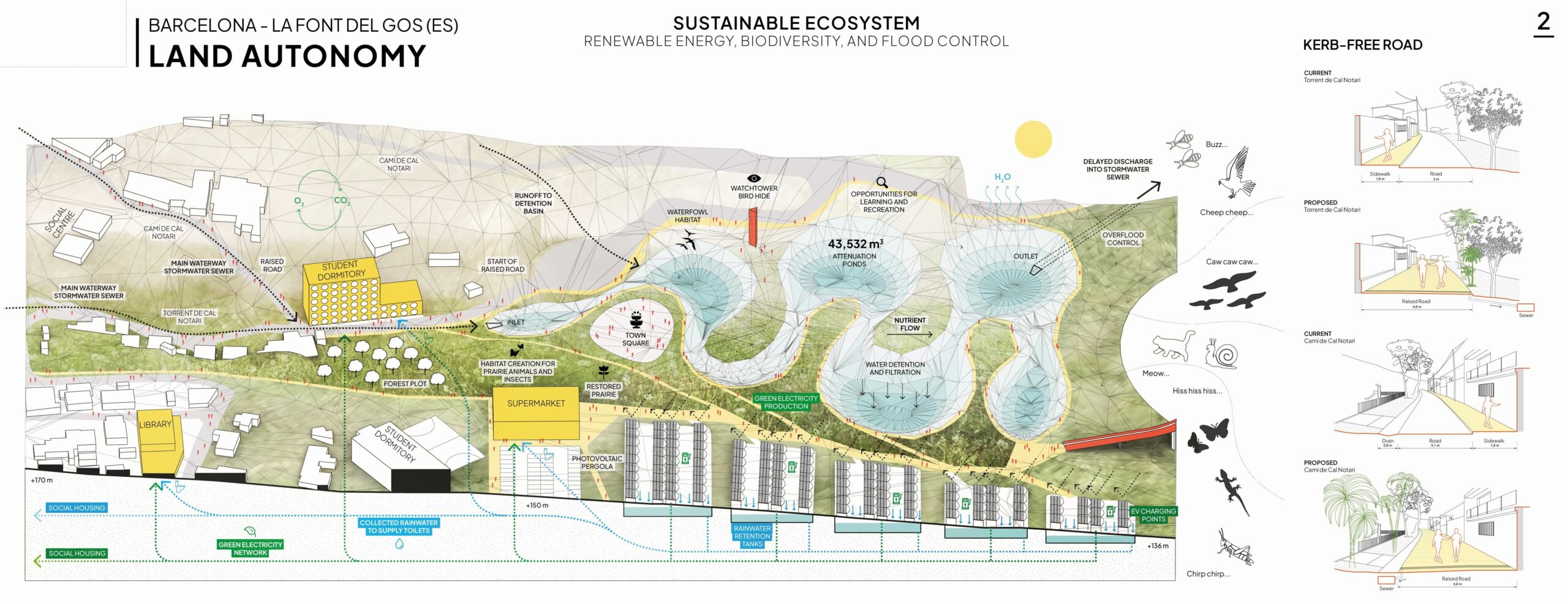 The present proposal positions La Font del Gos as the next opportunity for city-led, regenerative urbanism — but this time, grounded explicitly in natural elements. Drawing from the theory of land autonomy, the landscape is treated not as passive ground but as a co-agent in the transformation. The natural systems that were erased — the stream, the orchards, the biodiversity — are strategically reintroduced to shape urban life and community identity.
