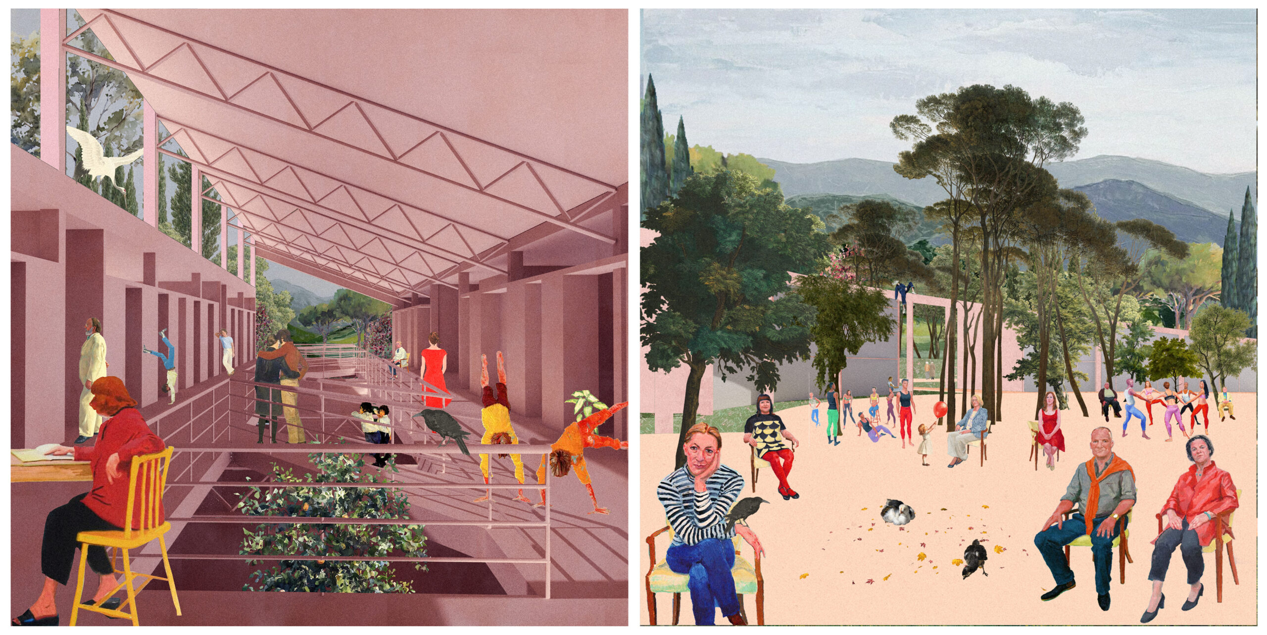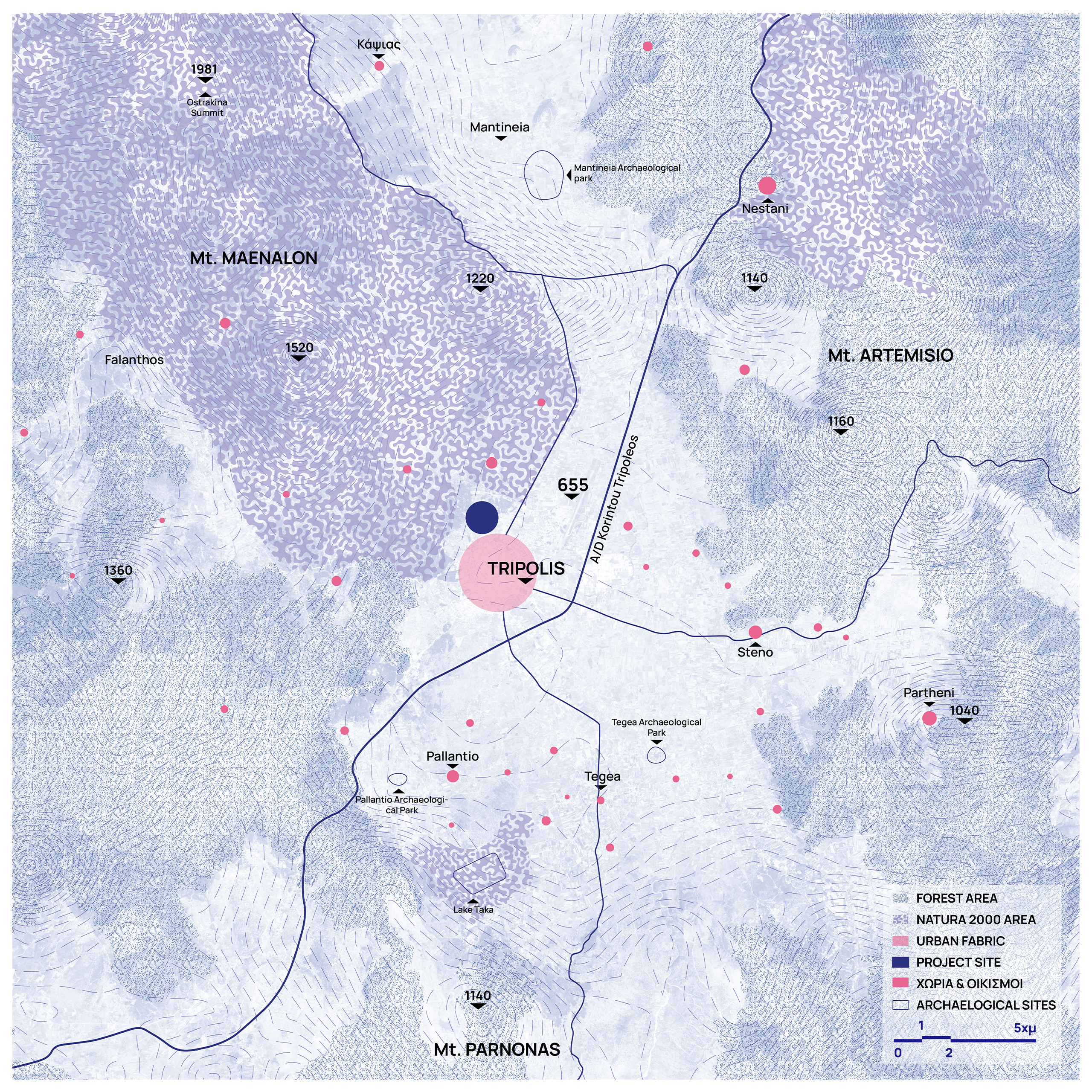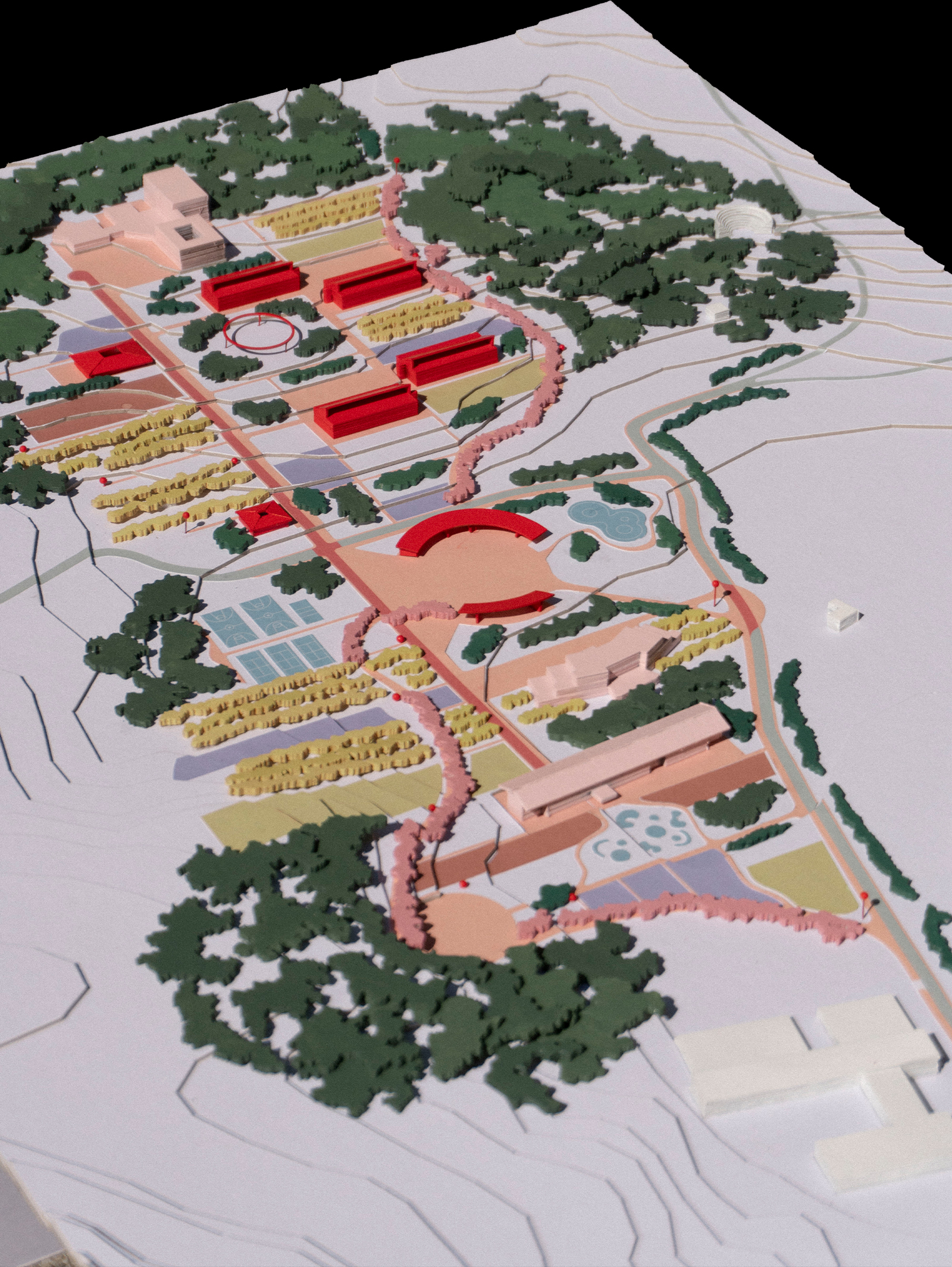 The framework is structured through a system of linear zones, inspired by the agricultural landscape and the spatial delineations of farmland plots in the Arcadian terrain. These zones determine the arrangement of buildings, open spaces, circulation routes, and planting, transforming the landscape into an organizational tool for the complex. A central circulation axis connects all buildings, while horizontal and vertical alignments support mobility requirements. A curvilinear pedestrian route traverses the composition from the entrance to its highest point, offering visual corridors toward the natural landscape. The core of the composition is a central square, functioning as both an entry point and a space of gathering. Built volumes, open spaces, circulation, and planting are organized linearly, enabling future expansions and the gradual “infiltration” of the Mediterranean landscape into the complex.