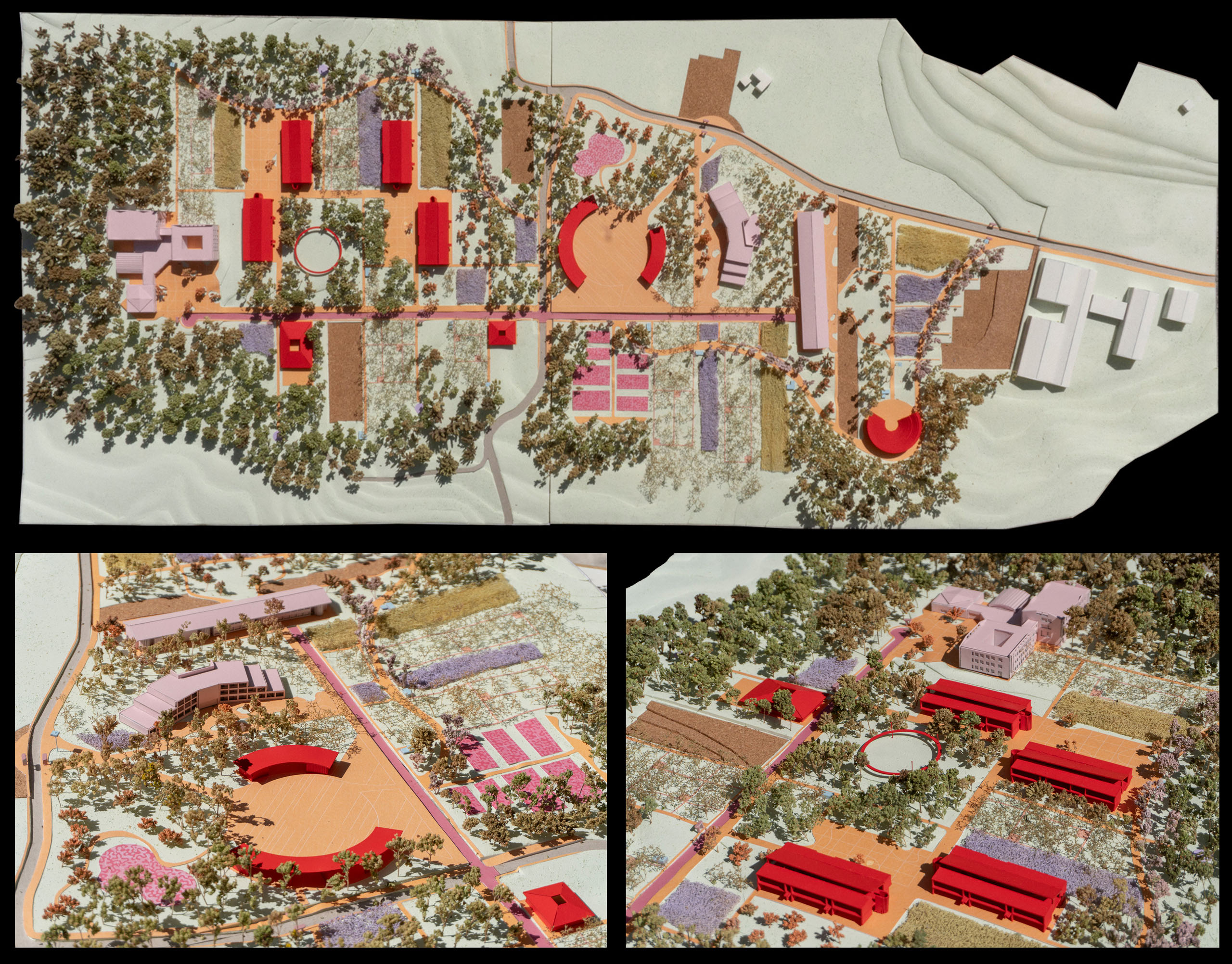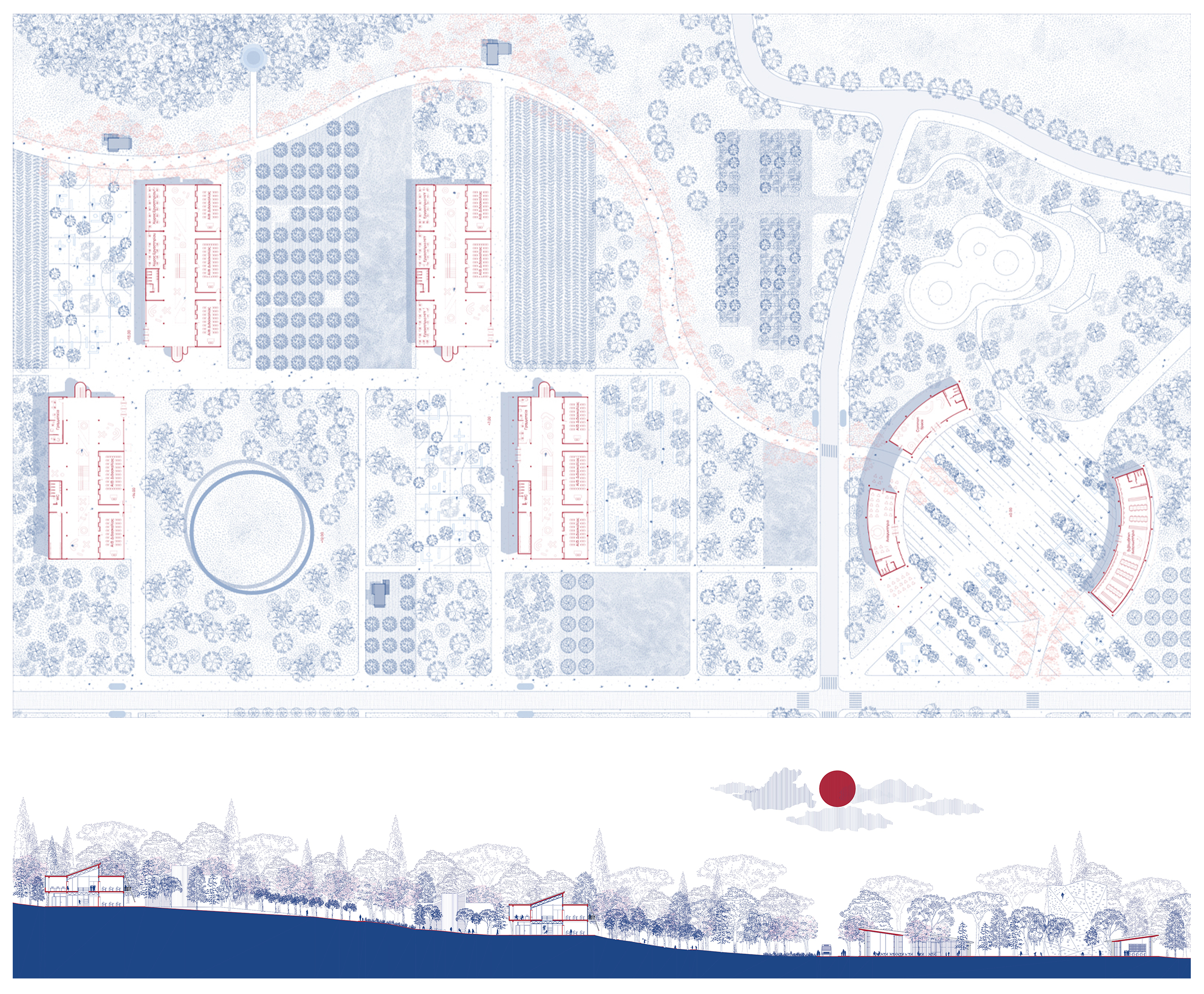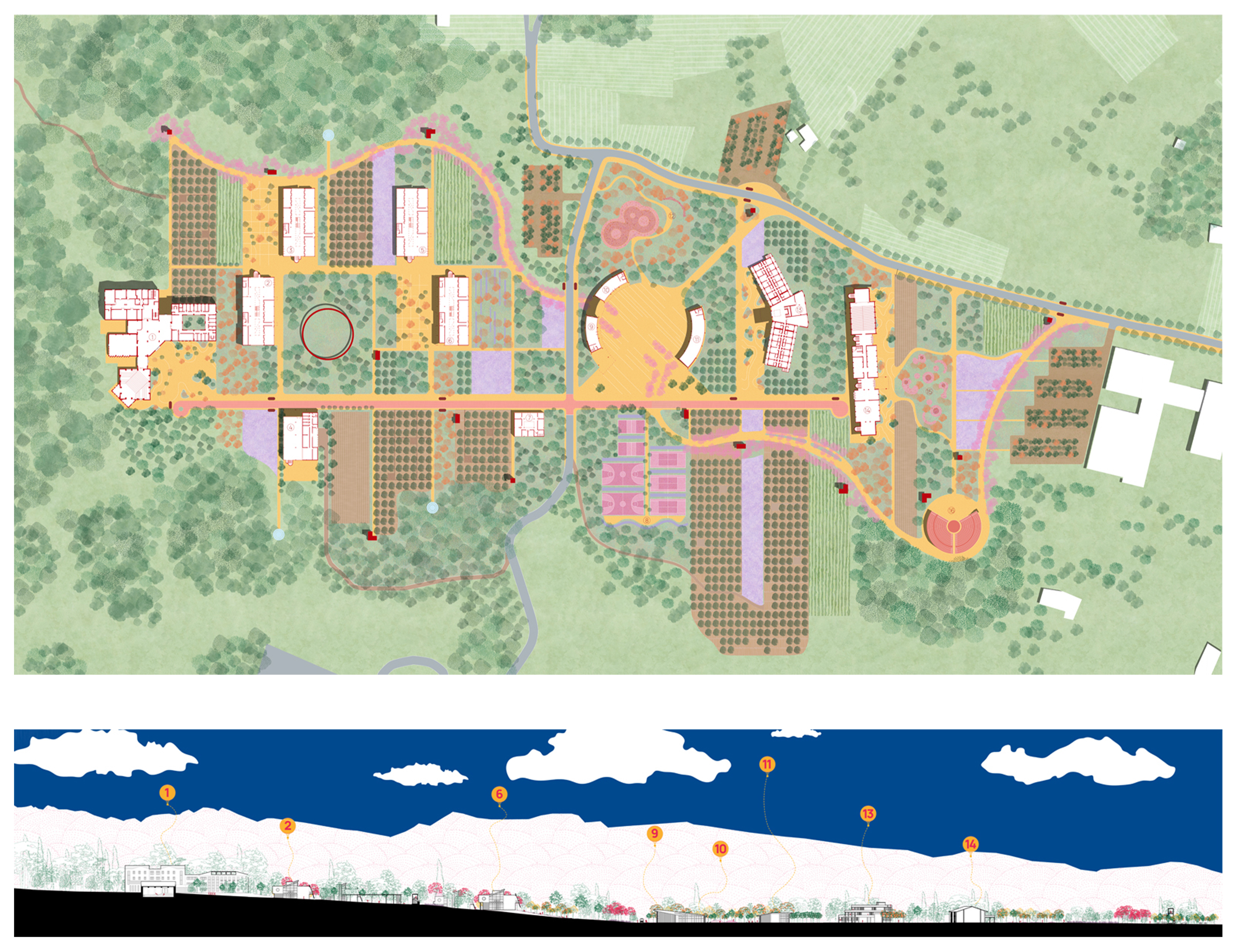 Planting constitutes a fundamental compositional component and includes tall and flowering vegetation, tree-lined paths, fruit orchards, vineyards and vegetable gardens, as well as aromatic gardens. Cultivated areas function both as a reference to the agricultural landscape and as a proposal for a university connected to the primary sector and the local economy, establishing a distinct and sustainable institutional identity.