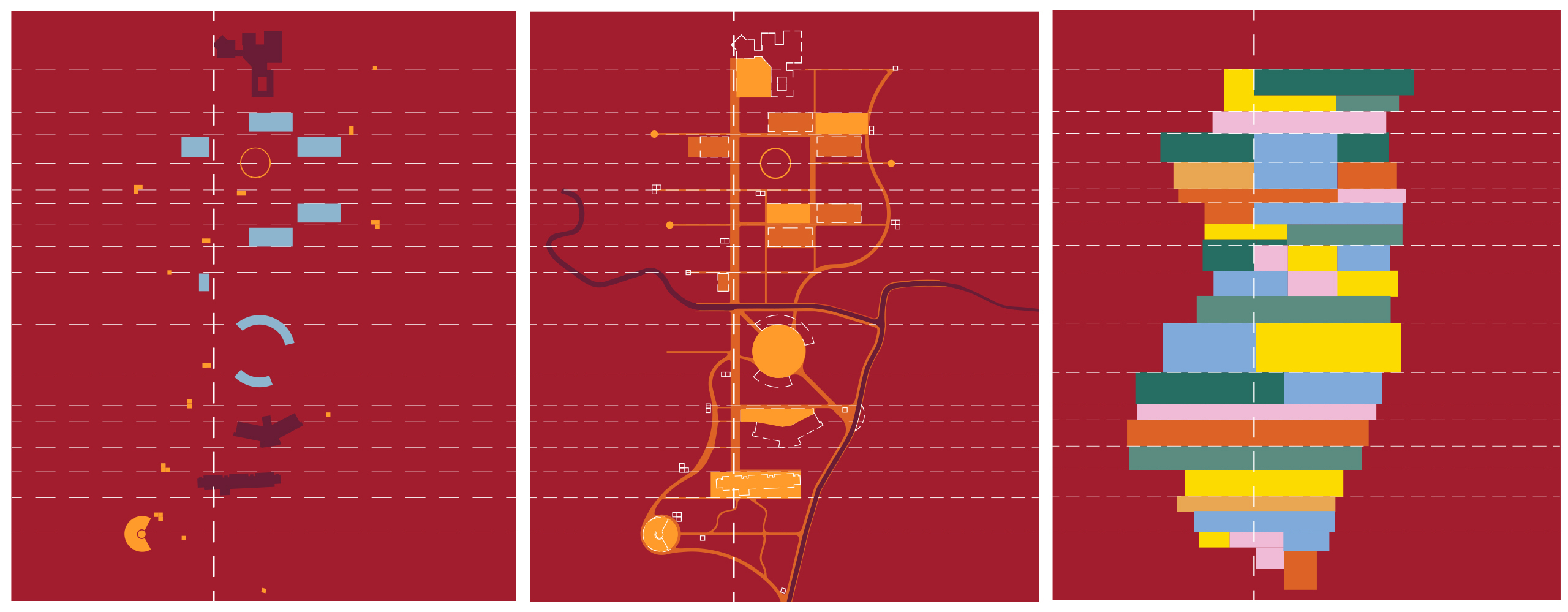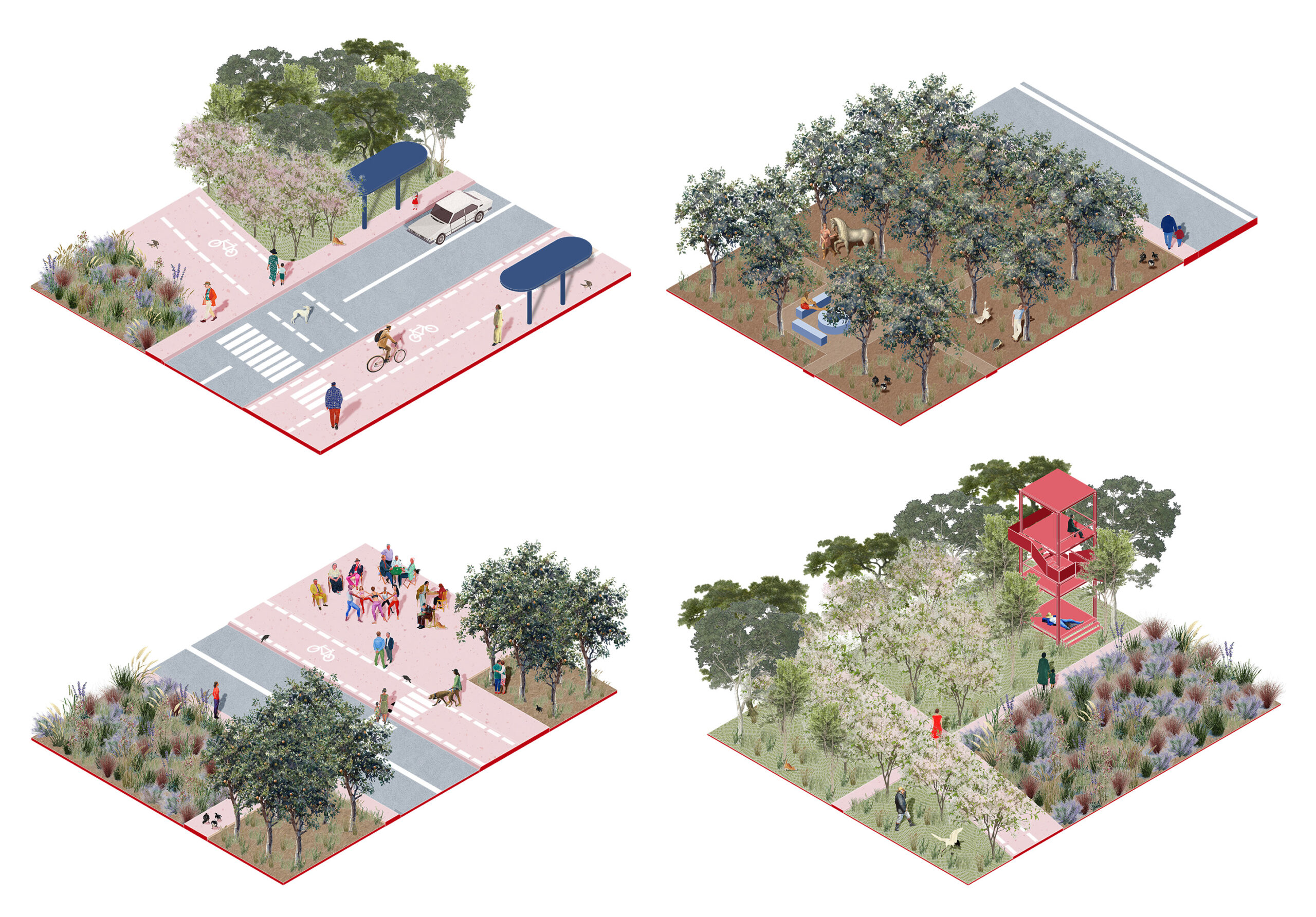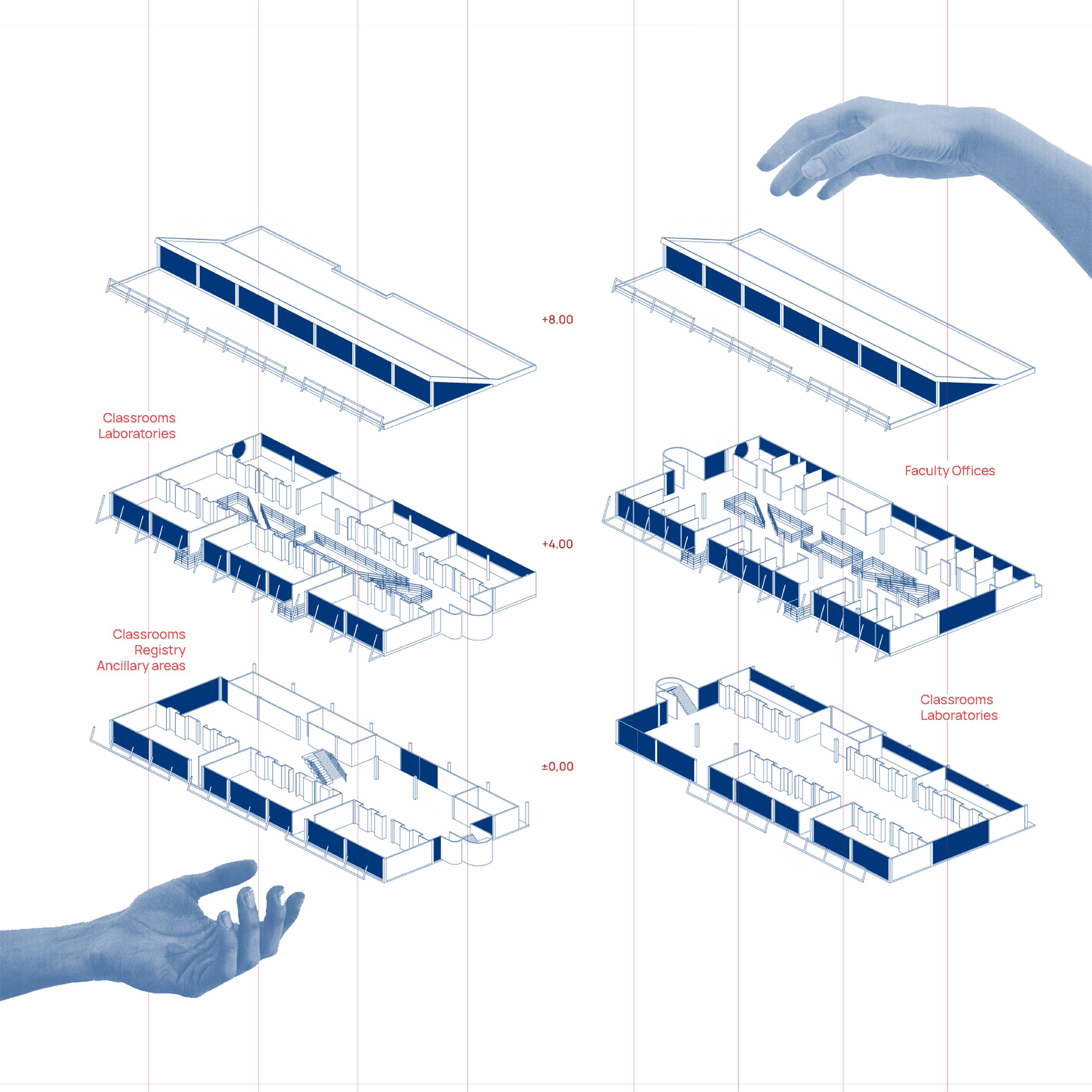Between the three existing buildings, new volumes are introduced to accommodate academic and public functions, along with smaller-scale interventions at key nodal points. Circulation is designed primarily for pedestrians and cyclists, with provisions for public transport and limited vehicular access. The complex is organized into four linear functional zones: culture, housing, public life, and education. The culture zone includes spaces for events and activities open to the city, while the housing zone accommodates the student residence. The public life zone concentrates outward-oriented functions around the central square, whereas the education zone, located at the edge of the composition, is structured around a planted “square”-clearing.
