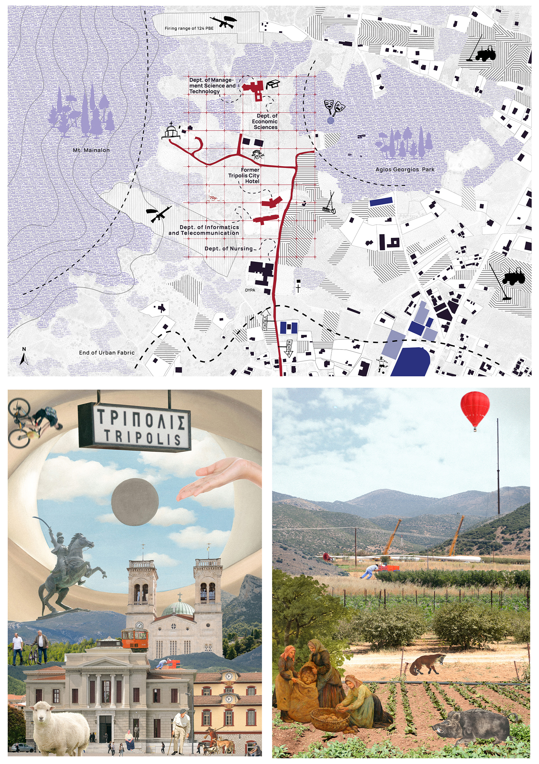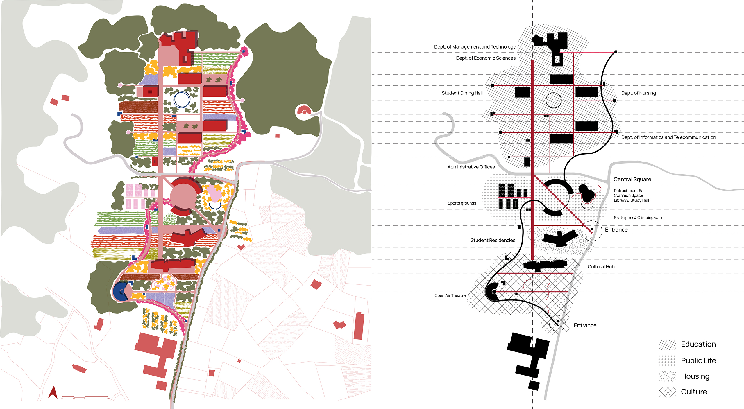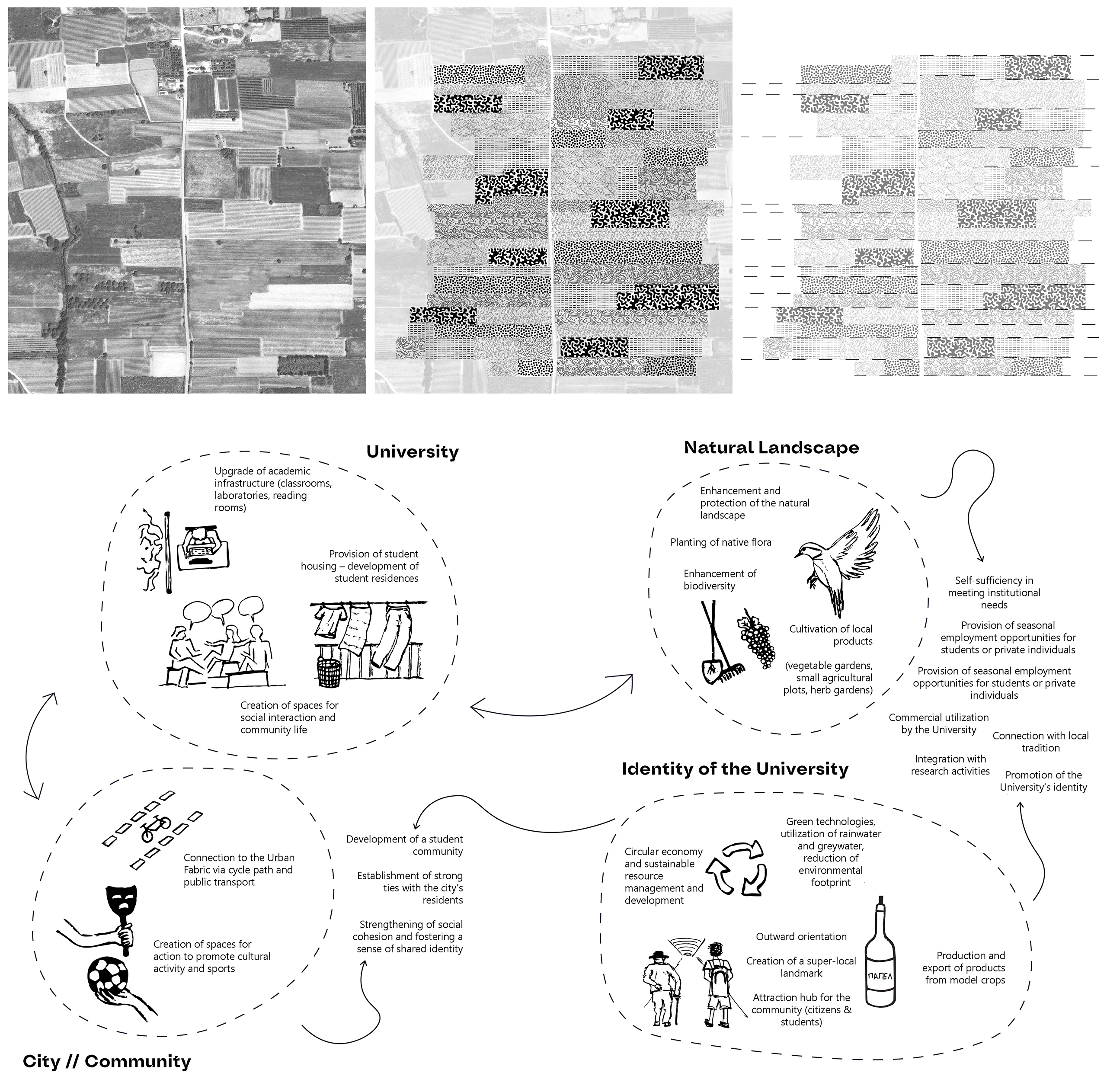 The project proposes the design of a university spatial framework that enhances academic activity, strengthens connections with the local community, and is integrated into the natural and agricultural landscape. The principal design axis is the interconnection of the existing, morphologically heterogeneous buildings and their incorporation into a unified network of spaces, movement, and activities. The University is conceived as a supra-local landmark, functioning as a connective link between the city and the surrounding landscape. The design builds upon existing conditions, seeking a balanced coexistence between the built environment and nature. A key intention is the formation of an accessible university framework, providing academic infrastructure, student housing, and spaces for social life, open to both the student body and the local community. Emphasis is also placed on sustainability, biodiversity, and the preservation of local vegetation and cultivation, aiming for an outward-looking University with a distinct identity and ties to local tradition.